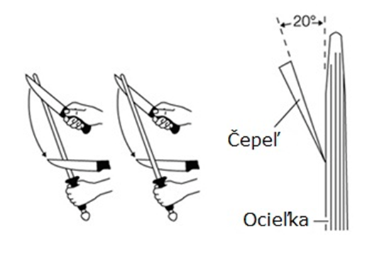Namočený brúsny kameň položte hrubšou stranou nahor pred seba na podložku tak, aby dlhšia strana smerovala od vás. Chyťte čepeľ noža oboma rukami, pod ostrým uhlom ju priložte k brúsnemu povrchu a rovnomernými ťahmi od seba, proti ostriu, začnite so zbrúsením. Povrch kameňa sa bude farbiť obrúsenou oceľou na tmavo, ostrie noža sa začne formovať. Takýmto spôsobom je potrebné vybrúsiť rovnomerne obe strany ostria.